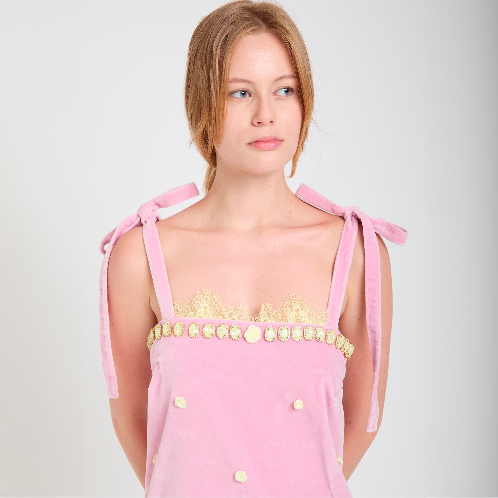 With a '60s silhouette, it has hand-sewed chrystal strass and delicate light yellow roses. The neckline is embellished with yellow lace on the cups. The shoulder straps tie at the top in a feminine bow.